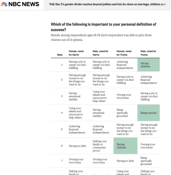 So what is the problem? Gen Zers, young men and women aged 18-29 stated their definition of success to pollsters at NBC. The young men who voted for Trump, that is the more conservate group, for the first time in history ranked having children and a family as their #1 sign of success. What an exciting trend! However, if you ask the young women who voted for Harris the same question, they rank family and children 12th out of thirteen. Basically dooming our future, economically and socially.